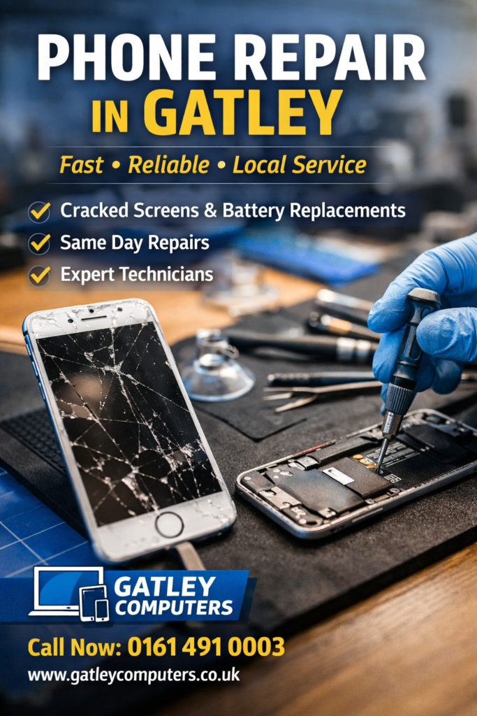 Phone Repair in Stockport & Manchester – Trusted Local Experts at Gatley Computers If you’re searching for reliable phone repair in Stockport or Manchester, Gatley Computers is your trusted local repair specialist. Located in Gatley, we support customers across Stockport, South Manchester, Cheadle, Cheadle Hulme, Heald Green, and Didsbury with fast, professional smartphone repairs. Your […]