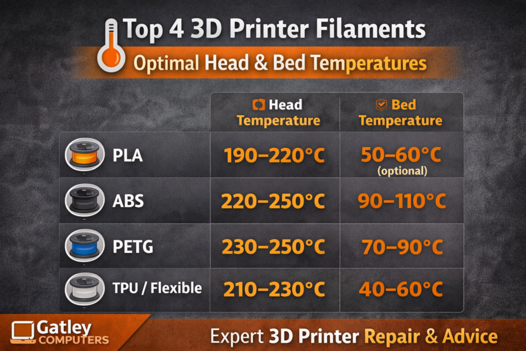 Top 4 3D Printer Filaments – Head & Bed Temps for Perfect Prints | Gatley Computers
